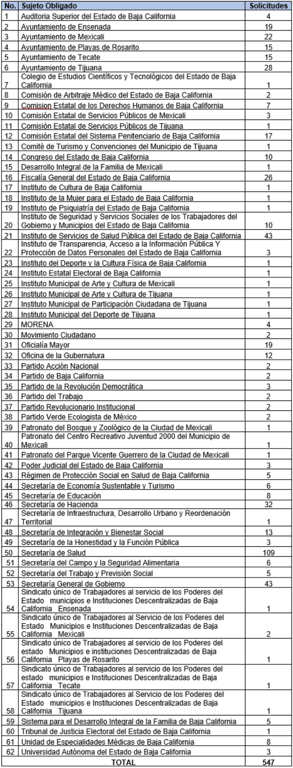Del 12 de marzo al 22 de noviembre de 2020, se han registrado 525 solicitudes de acceso a la información dirigidas a sujetos obligados del Estado de Baja California que se encuentran relacionadas con planteamientos del coronavirus causante de COVID-19. En una búsqueda de información inicial, comprendida en los siguientes periodos: